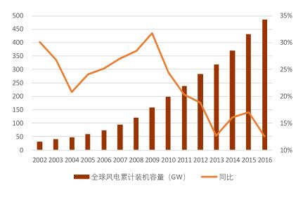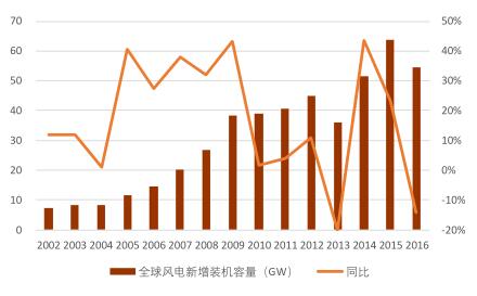 全球風(fēng)電新增裝機容量,2002-2009 年經(jīng)歷了高速發(fā)展期,年均復(fù)合增速達到 27%,2010-2016 年,波動較大,整體發(fā)展進入平穩(wěn)期,年均復(fù)合增速為 5%,但增量的絕對值較大。