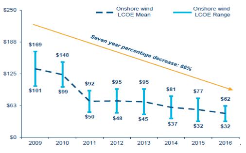 2009-2016 年,全球陸上風(fēng)電的度電成本,下降了 66%。