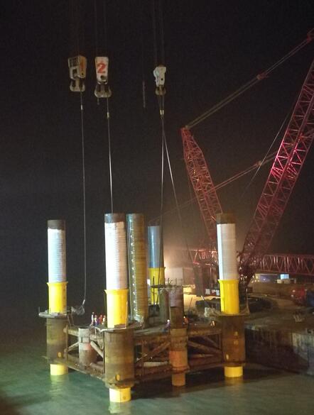 面對困難險阻,項目部職工理思路、凝智慧,付行動,披荊斬棘,奮勇前行,在公司領導的關(guān)心、指導、支持下,最終于11月15日下午完成全部沉樁任務。此次沉樁施工的順利結(jié)束標志著一航局第一次成功的在風電領域使用導管架工藝以及第一次成功使用振動錘與沖擊錘相結(jié)合的沉樁工藝,并為之后海上風電項目積累施工經(jīng)驗。