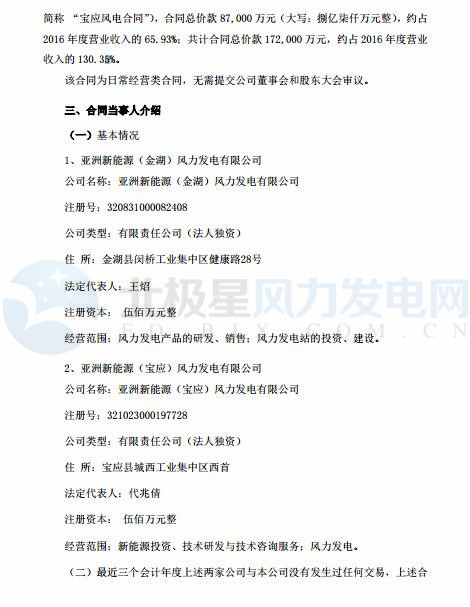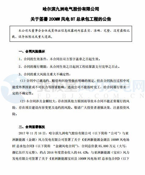 11 月16 日,哈爾濱九洲電氣股份有限公司與亞洲新能源(金湖)風力發(fā)電有限公司簽署了關(guān)于《亞洲新能源金湖縣 100MW 風電場 BT 總承包合同》,合同總價款 85,000 萬元;與亞洲新能源(寶應)風力發(fā)電有限公司簽署了關(guān)于《亞洲新能源寶應縣 100MW 風電場 BT 總承包合同》,合同總價款 87,000 萬元,約占 2016 年度營業(yè)收入的 65.93%;共計合同總價款 172,000 萬元,約占 2016 年度營業(yè)收入的 130.35%。