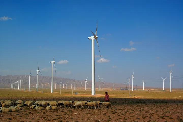 羊群與牧羊人在賀蘭山風(fēng)力發(fā)電場
