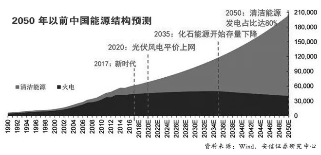2050年中國(guó)的能源結(jié)構(gòu)會(huì)是什么樣?假設(shè)從2017年開(kāi)始我國(guó)每年的發(fā)電量增長(zhǎng)為前三年發(fā)電量增長(zhǎng)的均值,以此為基礎(chǔ)預(yù)測(cè)每年的發(fā)電量。以 “到2035年,可再生能源對(duì)化石能源進(jìn)入全面存量替代的階段”和“到2050年時(shí),可再生能源在電力消費(fèi)中的比重達(dá)到80%”兩個(gè)論斷為依據(jù),預(yù)測(cè)火電每年的的發(fā)電量情況(假設(shè)2035年前后火電每年增長(zhǎng)率的增長(zhǎng)/下降速度相同),以及清潔能源的發(fā)展?fàn)顩r。