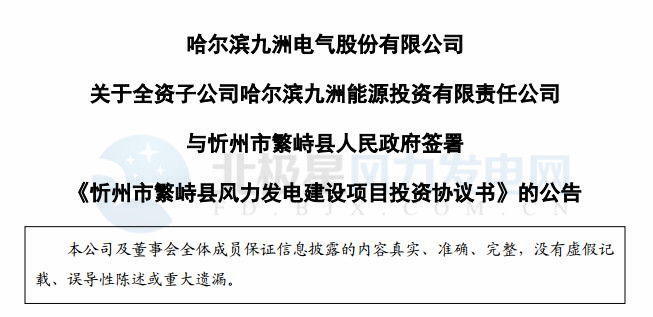 九洲電氣全資子公司簽署2個(gè)風(fēng)電項(xiàng)目共300MW 總投資30億元