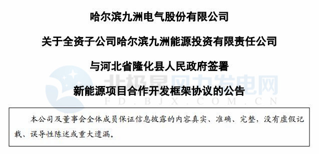 九洲電氣全資子公司哈爾濱九洲能源投資有限責(zé)任公司近日分別與河北省隆化縣政府、山西省忻州市繁峙縣政府簽署《新能源項(xiàng)目合作開(kāi)發(fā)框架協(xié)議》和《忻州市繁峙縣風(fēng)力發(fā)電建設(shè)項(xiàng)目投資協(xié)議書》,將在隆化縣太平莊鄉(xiāng)