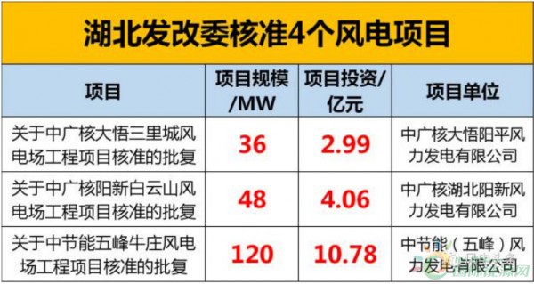 近日,湖北省發(fā)改委連續(xù)核準三個風電項目,項目規(guī)模共計204MW,總投資17.83億元!如下表所示: