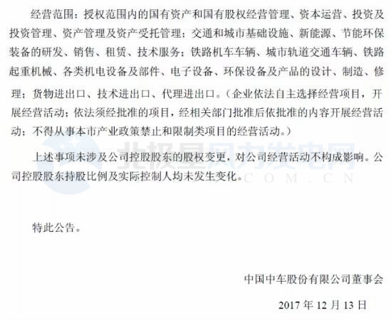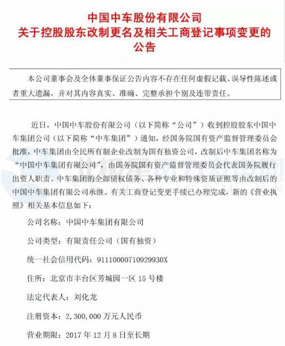 12月13日,中國中車股份有限公司發(fā)布《關于控股股東改制更名及相關工商登記事項變更》的公告,經(jīng)國務院國有資產(chǎn)監(jiān)督管理委員會批準,中國中車集團公司已經(jīng)由全民所有制企業(yè)改制為國有獨資公司,改制后的集團公司
