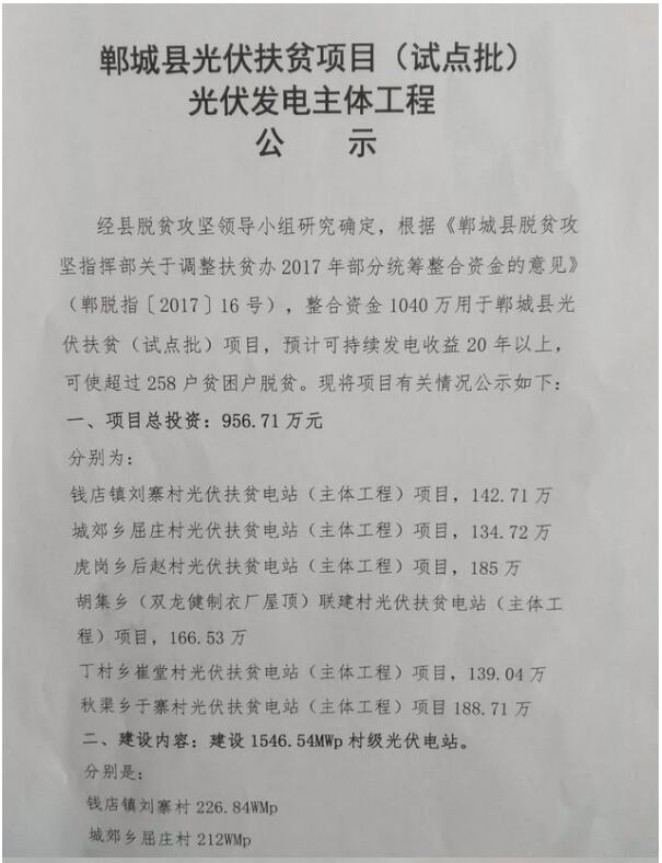12月20日,河南鄲城縣對(duì)光伏扶貧項(xiàng)目(試點(diǎn)批)光伏發(fā)電主體工程進(jìn)行公示,該光伏發(fā)電項(xiàng)目共投資956.71萬元,建設(shè)1546.54MWp村級(jí)光伏電站。