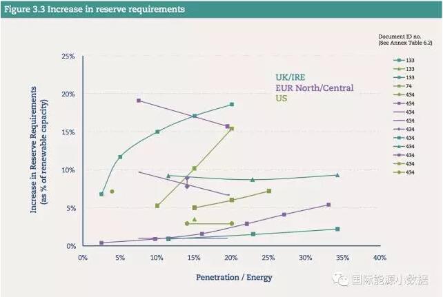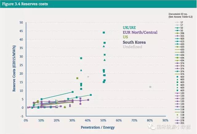 風(fēng)電光伏的系統(tǒng)成本首先要考慮相應(yīng)增加備用電源容量(reserve requirements)。如果風(fēng)電光伏發(fā)電占到電力需求的30%情況下,因?yàn)閭溆秒娫匆笤黾拥某杀炯s為5英鎊/兆瓦時(shí)(合人民幣4.3分/千瓦時(shí))。