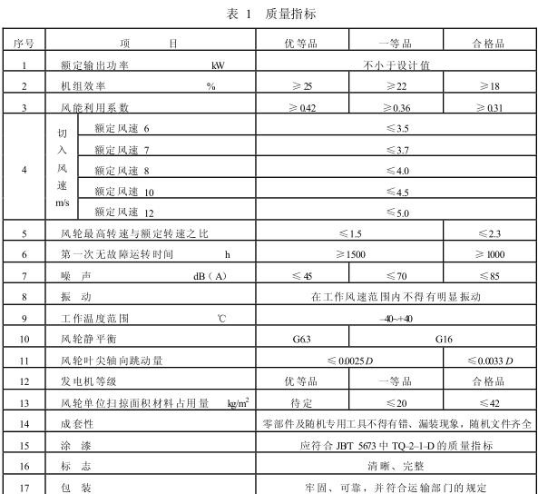 風(fēng)力發(fā)電機(jī)組產(chǎn)品各等級(jí)質(zhì)量指標(biāo)見(jiàn)表1。