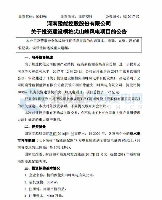 河南豫能控股股份有限公司12 月 26 日召開(kāi)董事會(huì) 2017 年第 6 次臨時(shí) 會(huì)議,審議通過(guò)了《關(guān)于投資建設(shè)桐柏尖山峰風(fēng)電項(xiàng)目的議案》,決定出資設(shè)立桐柏豫能尖山峰風(fēng)電有限公司,持股比例 100%,投資建設(shè)桐柏尖山峰風(fēng)電項(xiàng)目,該項(xiàng)目裝機(jī)規(guī)模50MW,注冊(cè)資本5000 萬(wàn)元,項(xiàng)目總投資 達(dá)到3.72 億元。以下是會(huì)議原文: