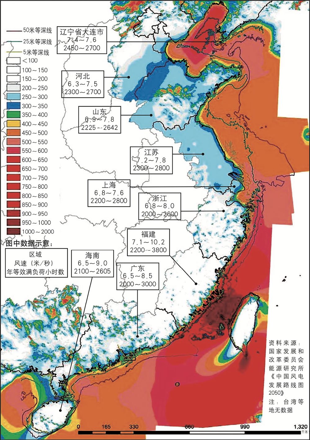我國沿海各區(qū)域風(fēng)能資源分布圖