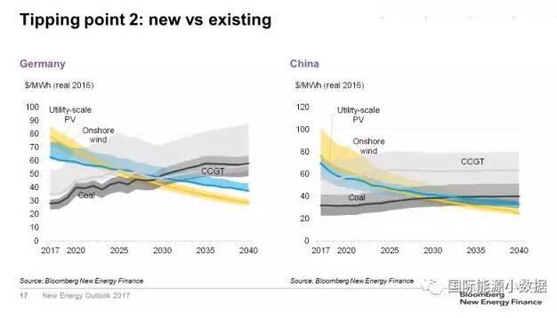第二個(gè)臨界點(diǎn)是:新建的風(fēng)電、光伏電站的發(fā)電成本低于現(xiàn)有煤電、天然氣電站的運(yùn)行成本。這個(gè)臨界點(diǎn)將比人們想象的更快到來。在中國(guó),預(yù)計(jì)2030年光伏成本將低于已有的煤電運(yùn)行成本;在美國(guó),光伏成本將從2027年起低于已有天然氣發(fā)電廠的運(yùn)行成本;在德國(guó),陸上風(fēng)電、光伏成本將在2027-2030年之間低于煤電、天然氣發(fā)電廠的運(yùn)行成本。