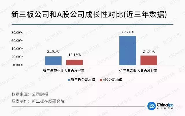 對比新三板公司和A股公司可以發(fā)現(xiàn),無論是最近三年的復合增長率還是2017年上半年的同比增長率,新三板公司都要強于A股公司,尤其是在凈利潤的增幅方面新三板公司更是勢頭強勁,將A股公司遠遠甩在了身后。