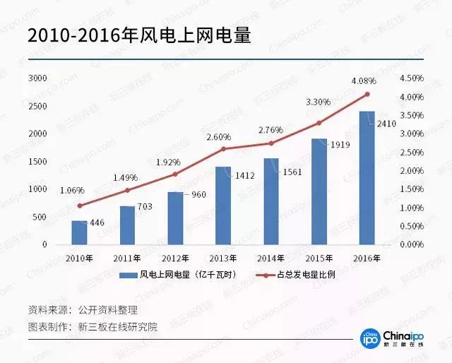 中國風電上網(wǎng)電量占總發(fā)電量比例逐年增加,2016年風電上網(wǎng)電量為2410億千瓦時,占總發(fā)電量的比重達4、08%,超越核電和光伏成為我國第一大新能源發(fā)電形式。