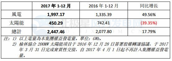 協(xié)合新能源2017年1-12月完成244.75億千瓦時(shí)(2,447.46GWh),同比增長17.79%。其中風(fēng)電發(fā)電量199.72億千瓦時(shí),同比增長49.56%。