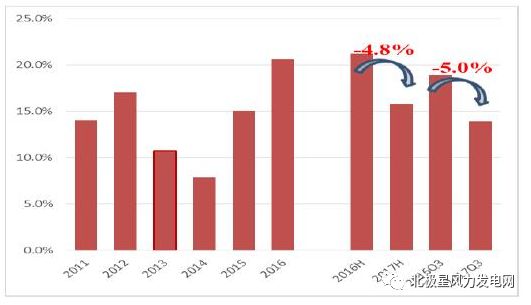 考慮到2017年并網(wǎng)項目中約2GW為去年完成吊裝,預(yù)測2017年全國風(fēng)電新增裝機較去年少4GW,約19.3GW左右。2017-2020年,保守預(yù)計風(fēng)電新增裝機每年在20GW以上,維持高位,預(yù)測“十三五”規(guī)劃最低并網(wǎng)容量為210GW。