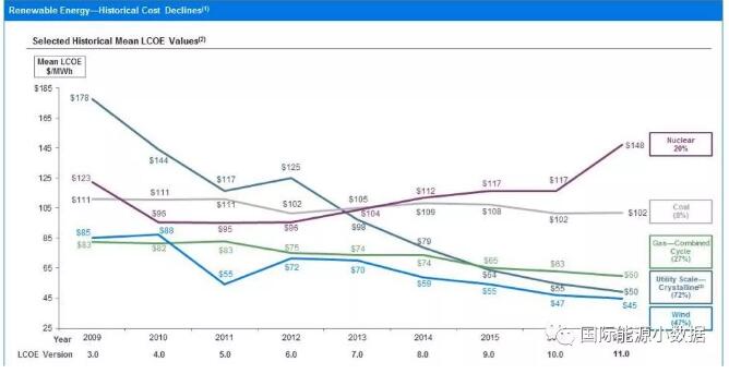 可再生能源一直被認(rèn)為是“昂貴”的能源,但是事情正在起變化。以美國為例,Lazard公司的數(shù)據(jù)表明,風(fēng)電(4.5美分/千瓦時(shí))、太陽能光伏(5.0美分/千瓦時(shí))度電成本已經(jīng)低于天然氣發(fā)電(聯(lián)合循環(huán)發(fā)電6美分/千瓦時(shí)),大大低于煤電(10美分/千瓦時(shí))。