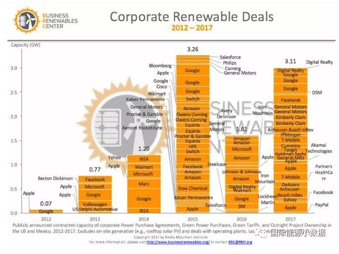 各國公司以可再生能源供電為榮,這一趨勢還在持續(xù)擴(kuò)大。到2017年止,各國大公司(如谷歌、Facebook)簽下的可再生能源供電累計(jì)達(dá)到10吉瓦,其中3吉瓦是2017年新簽購電合同。