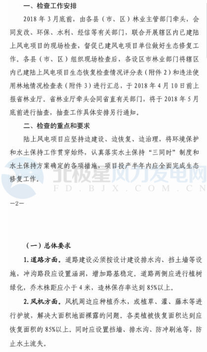 北極星風(fēng)力發(fā)電網(wǎng)小編從通知中發(fā)現(xiàn),專項檢查重點針對項目道路建設(shè)、風(fēng)機(jī)周邊防護(hù)、青山掛白治理、棄土棄渣等臨時用地植被恢復(fù)情況,并且對生態(tài)修復(fù)等級評判分為合格、不合格二個等次。針對專項檢查結(jié)果,對違法違規(guī)使用林地的風(fēng)電企業(yè),林業(yè)部門將按有關(guān)法律法規(guī)查處,發(fā)改部門將其列入失信名單。對生態(tài)修復(fù)工作不達(dá)標(biāo)、效果差的,要求限期整改,對整改仍不到位的,暫停其上網(wǎng)電費結(jié)算。
