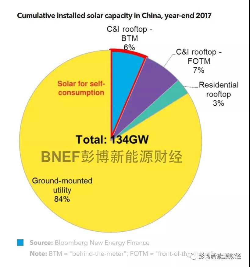 到2017年底,中國大陸光伏裝機總量達(dá)134GW(BNEF統(tǒng)計口徑),其中屋頂裝機(含工商業(yè)與居民)達(dá)到21GW,自發(fā)自用工商業(yè)屋頂裝機達(dá)8GW。