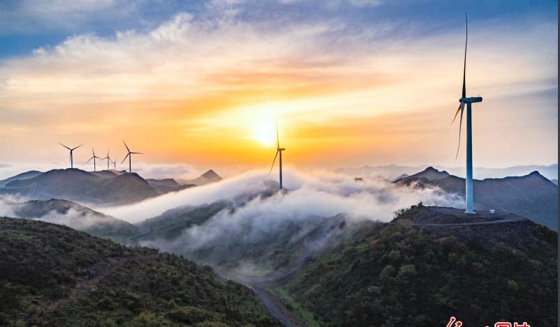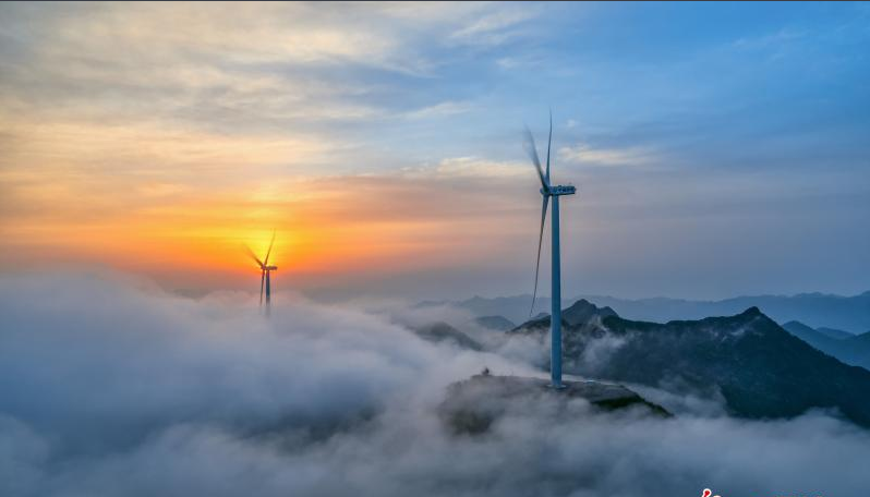 2018年5月15日,重慶豐都縣武平鎮(zhèn)大風(fēng)門(mén)風(fēng)電廠在霞光云霧裝扮下呈現(xiàn)出仙境般的美麗畫(huà)卷。
