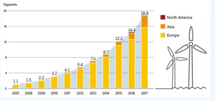 據(jù)全球風(fēng)能理事會(GWEC)“2017全球風(fēng)電報(bào)告”數(shù)據(jù),2017年,全球9大海上風(fēng)電市場裝機(jī)容量歷史性地增長了4,334MW,相比于2016年增長了95%。全球海上風(fēng)電累計(jì)裝機(jī)容量達(dá)18,814MW,較2016年(14,384MW)增長30%。