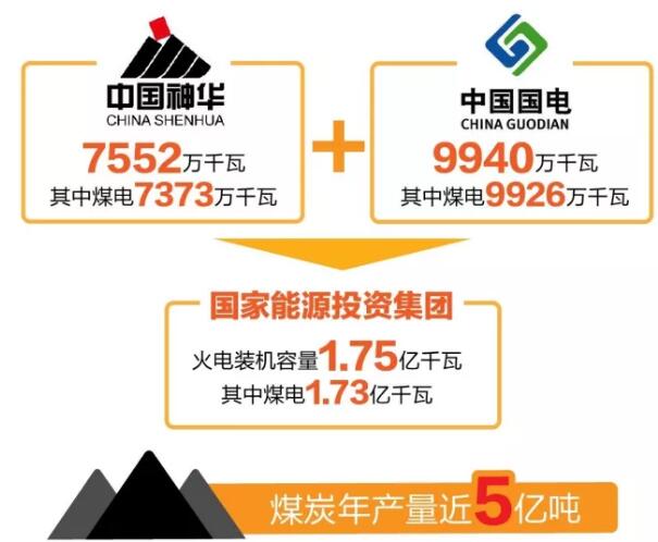 從火電裝機容量來看,目前神華集團擁有7552萬千瓦(其中煤電7373萬千瓦)、國電集團擁有9940萬千瓦(其中煤電9926萬千瓦),整合后的國家能源投資集團火電裝機容量將達到1.75億千瓦(其中煤電1.73億千瓦)。兩家合并后,國家能源投資集團的煤炭年產量近5億噸,可以為內部煤電提供穩(wěn)定的煤炭供應,形成產業(yè)鏈協(xié)同效益。