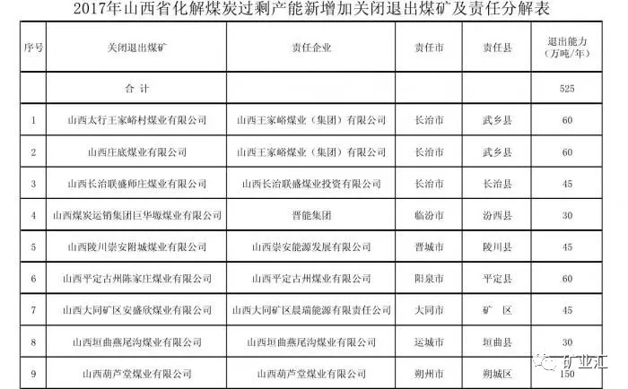 日前,山西省政府發(fā)布《關(guān)于分解下達(dá)2017年煤炭行業(yè)化解過(guò)剩產(chǎn)能新增加目標(biāo)任務(wù)的通知》(下稱《通知》)提出,2017年山西省新增加退出煤炭產(chǎn)能525萬(wàn)噸,關(guān)閉退出9座煤礦。