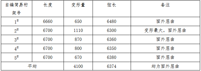 事發(fā)操作平臺(tái)的5榀簡易桁架的變形量見表2,其中自編2#簡易桁架的變形量最大,達(dá)到1110mm。見圖2。