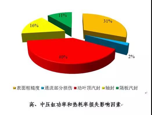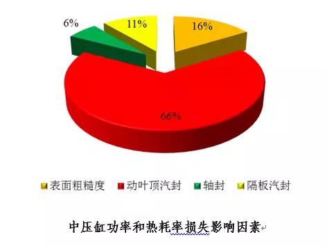 在各因素中,對(duì)高、中壓缸功率和熱耗率影響最大的是動(dòng)葉頂汽封,占總損失的40%,其次是表面粗糙度,占31%,軸封和隔板汽封影響分別占16%和11%,通流部分損傷占2%。
