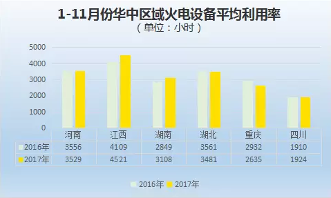 2017年1-11月華中區(qū)域江西、河南、湖北、湖南、重慶、四川火電設(shè)備平均利用小時數(shù)分別為4521小時、3529小時、3481小時、3108小時、2635小時、1924小時。除江西、湖南外,其他地區(qū)火電設(shè)備平均利用小時數(shù)都出現(xiàn)了下滑。