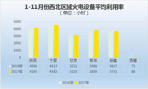 2017年1-11月份寧夏、陜西、青海、西藏火電設(shè)備平均利用小時數(shù)高于上年同期水平,分別為4582小時、4193小時、3836小時、88小時。甘肅、新疆的火電設(shè)備平均利用小時數(shù)與上年同期相比出現(xiàn)下滑,分別為3103小時、3731小時,下滑了118小時、86小時。