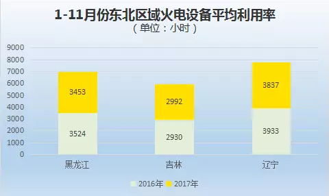 黑龍江、吉林、遼寧2017年1-11月份火電設(shè)備平均利用小時數(shù)分別為3453小時、2992小時、3837小時,與上年同期相比,僅吉林出現(xiàn)小幅上升,黑龍江、遼寧均出現(xiàn)71小時、96小時的下滑。
