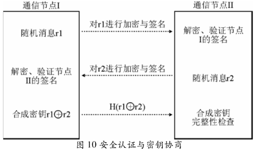 iv、節(jié)點II同樣對合成密鑰作哈希運算,作D=H (r1r2),比較C與D是否相同,如果相同,則密鑰協(xié)商與認證