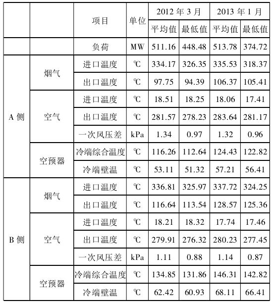 式中:Tw為排煙溫度;為空預器進口風溫。由公式(1)可知,當機組負荷降低時,排煙溫度下降,尤其冬季環(huán)境溫度低,排煙溫度和空預器進口風溫隨之更低,造成空預器冷端金屬壁溫降低。下面表2是2012、013空預器發(fā)生堵塞時候的運行數(shù)據(jù):