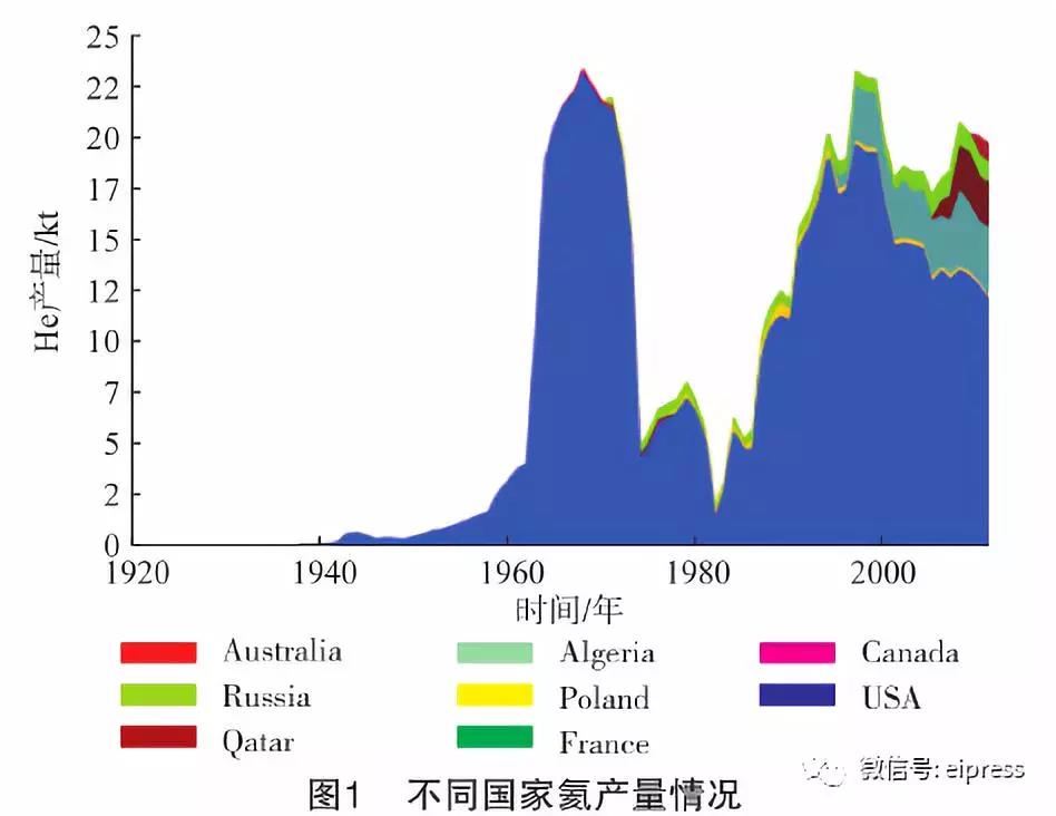 2016年,我國(guó)氦進(jìn)口主要來(lái)自卡塔爾(48.9%(w))、美國(guó)(38.7%(w))和澳大利亞(12.4%(w)),而我國(guó)生產(chǎn)的氦只能滿足少量重要用戶的需要。氦是放射性衰變的產(chǎn)物,只在少部分天然氣中以較高的濃度存在。天然氣提氦是目前氦商業(yè)應(yīng)用的唯一來(lái)源。美國(guó)是全球主要的氦生產(chǎn)國(guó),對(duì)世界氦的供給仍有絕對(duì)的話語(yǔ)權(quán)。不同國(guó)家的氦產(chǎn)量見(jiàn)圖1。