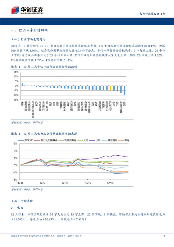 2018年12月份初至25日,電力及公用事業(yè)板塊表現(xiàn)略贏大盤,CS電力及公用事業(yè)指數(shù)在期間下跌0 17%,滬深300指數(shù)下跌4 90%,電力及公用事業(yè)跑贏大盤4 73個百分點。