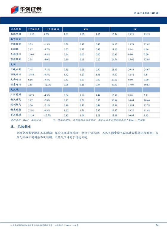 全社會用電量增速不及預期;煤價上漲過快風險;電價下調(diào)風險。調(diào)峰儲氣設施建設推進不及預期;天然氣價格機制調(diào)整不及預期;天然氣下游需求增速放緩。