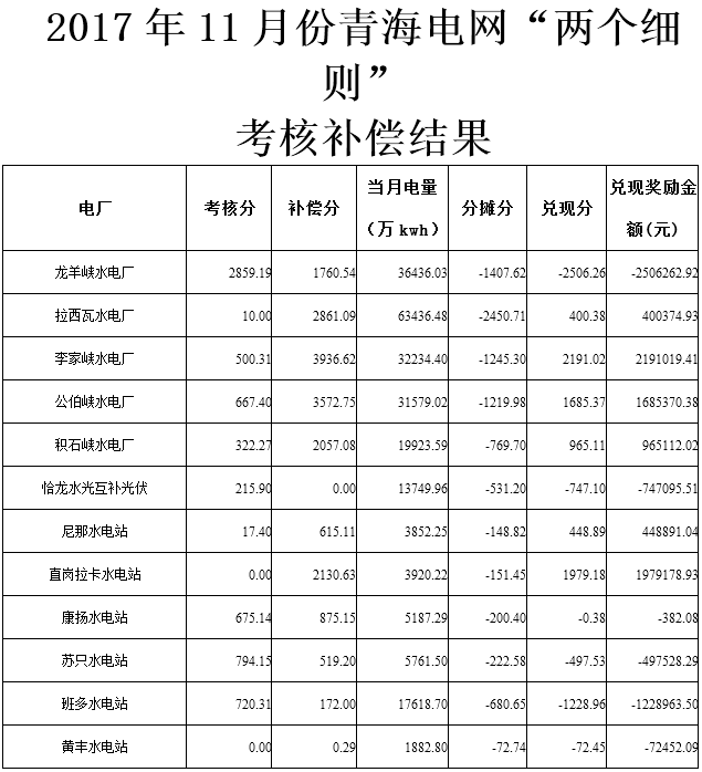 2017年11月份青海電網(wǎng)“兩個細則”考核補償情況