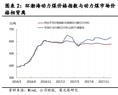 由于2017年中國經(jīng)濟(jì)增長(zhǎng)良好,電力及相應(yīng)煤炭消費(fèi)持續(xù)回暖。而在去產(chǎn)能以及先進(jìn)產(chǎn)能釋放不及預(yù)期的情況下,原煤產(chǎn)量的同比增速持續(xù)低于火電發(fā)電量的同比增速(圖表4)。因此,2017年全年煤炭供需持續(xù)處于緊平衡的狀態(tài),這也導(dǎo)致動(dòng)力煤價(jià)格長(zhǎng)期高于發(fā)改委劃定的綠色價(jià)格區(qū)間。按照發(fā)改委等四部委印發(fā)的《關(guān)于平抑煤炭市場(chǎng)價(jià)格異常波動(dòng)的備忘錄的通知》中關(guān)于煤炭?jī)r(jià)異常波動(dòng)預(yù)警機(jī)制,當(dāng)動(dòng)力煤價(jià)格在重點(diǎn)煤炭企業(yè)動(dòng)力煤中長(zhǎng)期基準(zhǔn)合同價(jià)格6%上下波動(dòng)時(shí),動(dòng)力煤價(jià)格處于綠色區(qū)間,即處于正常價(jià)格區(qū)間。2017年重點(diǎn)煤炭企業(yè)Q5500動(dòng)力煤中長(zhǎng)期基準(zhǔn)合同價(jià)格為535元/噸,動(dòng)力煤價(jià)格的綠色區(qū)間應(yīng)當(dāng)在500至570元/噸之間。截至2018年1月3日,環(huán)渤海Q5500動(dòng)力煤價(jià)格指數(shù)為578元/噸,秦皇島港山西產(chǎn)Q5500動(dòng)力煤價(jià)格為630元/噸,均高于發(fā)改委劃定的綠色價(jià)格區(qū)間。