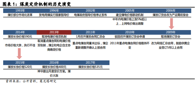 中國在1993年開始進(jìn)行煤炭?jī)r(jià)格部分市場(chǎng)化改革(圖表1),政府為了確保電價(jià)穩(wěn)定,設(shè)定了國有大型電廠的電煤價(jià)格,從而形成了“計(jì)劃煤”與“市場(chǎng)煤”之間的價(jià)格雙軌制,但是這也造成了煤電企業(yè)的長(zhǎng)期矛盾。“計(jì)劃煤”實(shí)行政府指導(dǎo)價(jià),主要供應(yīng)國內(nèi)大中型電廠(約占煤炭總產(chǎn)量的60%);“市場(chǎng)煤”則主要根據(jù)市場(chǎng)供需情況由企業(yè)自主銷售,價(jià)格由市場(chǎng)來決定(約占煤炭總產(chǎn)量的40%)。在實(shí)際執(zhí)行過程當(dāng)中,“計(jì)劃煤”的價(jià)格遠(yuǎn)低于市場(chǎng)價(jià)格,所以煤炭生產(chǎn)企業(yè)為實(shí)現(xiàn)利益最大化,更傾向于通過市場(chǎng)渠道銷售煤炭,從而造成與發(fā)電企業(yè)重點(diǎn)合同兌現(xiàn)率普遍偏低,發(fā)電企業(yè)則只能通過市場(chǎng)渠道進(jìn)行采購,來彌補(bǔ)煤炭需求缺口。