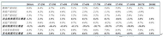 截至 2017 年 9 月,下游各領域消費量分別為電力(14.1 億噸,-0.02%)、冶金(5 億噸,+0.2%)、建材(2.3億噸,-37.9%)、供熱(1.6 億噸,+7.8%)、化工(1.3 億噸,-13.5%)和其他行業(yè)耗煤量(4.3 億噸,+219.5%)。下游電力和冶金行業(yè)耗煤量的逐漸企穩(wěn)成為了 2017 年煤炭需求回暖的根本保障,而其他行業(yè)耗煤量的顯著回升則是需求提升的主要因素。
