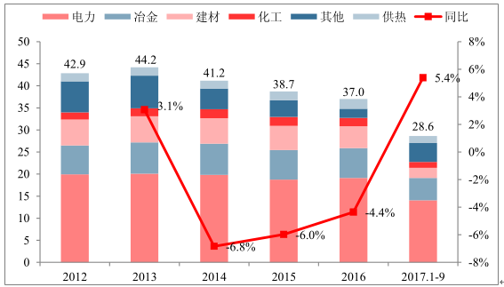 煤炭下游消費按行業(yè)劃分(2017.1-9)