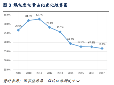 作為以煤為主的資源型國家,我國的發(fā)電能源也是以電煤為主。近年來,發(fā)電裝機(jī)容量中60%是煤電,發(fā)電量中約70%是煤電。一方面,按照目前的技術(shù)成熟度和成本優(yōu)勢來看,煤電是我國最穩(wěn)定的配套電源,我國煤電規(guī)模巨大,年均發(fā)電量在40000億千瓦時(shí)左右,據(jù)最新統(tǒng)計(jì)數(shù)據(jù)顯示,2017年,煤電發(fā)電量約為42000億千瓦時(shí),在發(fā)電量中約占66.7%,雖然比2016年發(fā)電量占比67.5%略有回落,但煤電亦向高效清潔利用轉(zhuǎn)型,其他任何能源在今后相當(dāng)長時(shí)間內(nèi)還不可能完全取代煤電在電源結(jié)構(gòu)中的核心地位;另一方面,近年來煤電發(fā)電量占比一直在降低,進(jìn)入“十三五”以來,煤電發(fā)電量占比降速逐漸放緩,也就是說,為保障我國未來用電剛性需求,未來煤電將更多地承擔(dān)支撐電力系統(tǒng)運(yùn)行、給系統(tǒng)調(diào)峰等作用,但煤電仍是我國的主力電源,在電力系統(tǒng)中的主體地位不會(huì)發(fā)生變化。