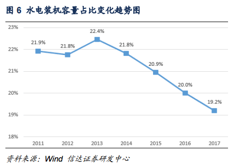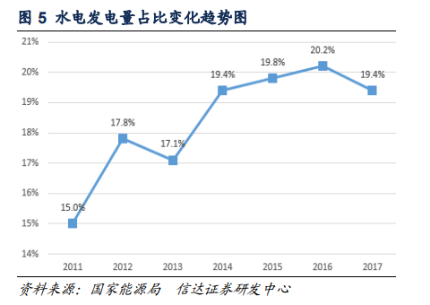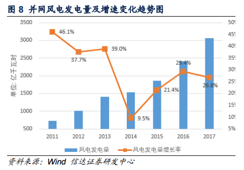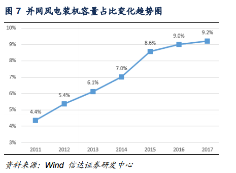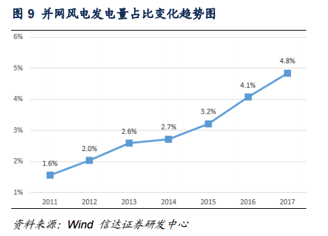 從發(fā)電量角度而言,2017年水電發(fā)電量約為12211億千萬時(shí),水電發(fā)電量增速由2016年的3.8%降至2.2%,水電發(fā)電量在全國全社會(huì)用電量中的占比也由2016年的20.2%降至2017年的19.4,這主要是因?yàn)樽罱鼉赡隁夂蛟驅(qū)е碌乃坎粔虺渥?,未來我們預(yù)計(jì)水電發(fā)電量在全社會(huì)用電量中的占比將維持在20%左右;近年來,風(fēng)電裝機(jī)容量在發(fā)電設(shè)備裝機(jī)總量中的占比不斷提高,2017年,風(fēng)電發(fā)電量約為3057億千瓦時(shí),約占全社會(huì)用電量的4.8%,并網(wǎng)風(fēng)電裝機(jī)容量占比達(dá)到9.2%,整體上呈現(xiàn)逐漸上升的趨勢。
