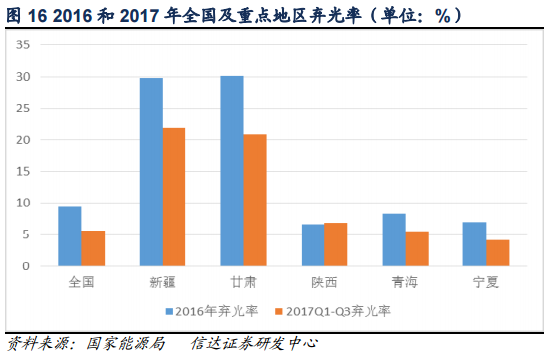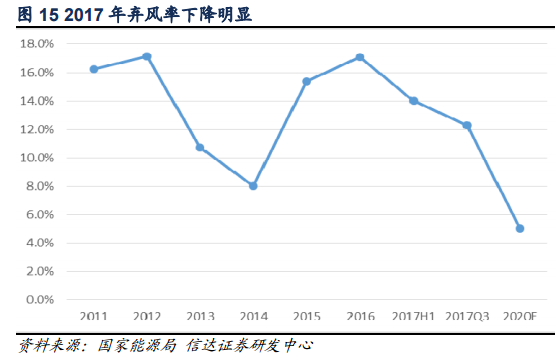 2017年,我國重點(diǎn)省份及主要河流(河段)利用良好,除了金沙江中游和大渡河地區(qū)水能利用率不到70%,其他地區(qū)和河流水能利用率都在85%以上;2017年,棄風(fēng)問題有所緩解,全國風(fēng)電發(fā)電量3057億千瓦時(shí),設(shè)備平均利用小時(shí)1948小時(shí)、同比提高203小時(shí)。棄風(fēng)電量419億千瓦時(shí),同比減少78億千瓦時(shí)。2017年,全國光伏發(fā)電量1568.2億千瓦時(shí),全國棄光電量73億千瓦時(shí)。全國棄光率5.6%,同比下降了3.8個(gè)百分點(diǎn)??梢钥闯?,2017年的棄風(fēng)、棄光情況較2016年下降了不少,但離國家規(guī)劃的2020年棄風(fēng)率5%以內(nèi)、棄光率3%以內(nèi)的目標(biāo)還有一定距離。隨著棄水棄風(fēng)棄光問題的解決,煤電發(fā)電份額將下降。