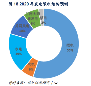 2018年能源工作會(huì)議提出,要聚焦綠色發(fā)展,著力解決清潔能源消納問題。按照非化石能源消費(fèi)比重達(dá)到15%左右的要求,到2020年,非化石能源發(fā)電裝機(jī)將達(dá)到7.7億千瓦左右,按照煤電“去產(chǎn)能”及清潔能源消納的相關(guān)政策要求,我們預(yù)測,到2020年:全國發(fā)電裝機(jī)容量約為20億千瓦,其中煤電裝機(jī)容量不會(huì)超過11億千瓦,氣電裝機(jī)容量將達(dá)到1.2億千瓦,常規(guī)水電裝機(jī)將達(dá)到3.7億千瓦,風(fēng)電裝機(jī)將達(dá)到2.1億千瓦,太陽能發(fā)電裝機(jī)將達(dá)到1.5億千瓦,核電裝機(jī)將達(dá)到0.5億千瓦,非化石能源發(fā)電裝機(jī)總量將達(dá)到7.8億千瓦左右。到2020年,煤電的電源結(jié)構(gòu)占比將由2017年的58%降至55%,煤電“去產(chǎn)能”將微調(diào)電源結(jié)構(gòu)。