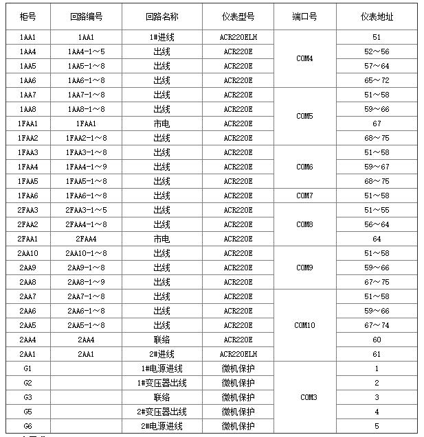 網(wǎng)球中心整個配電系統(tǒng)分為高低壓兩個部分,分別位于高壓變電所及低壓變電所,智能電力監(jiān)控系統(tǒng)位于配電室旁邊的電力監(jiān)控值班室。其中高壓配電室共計5個回路,分別為10kV進(jìn)線、10kV進(jìn)線2、1#變壓器出線、2#變壓器出線及聯(lián)絡(luò);低壓變電所共計145個回路,分別采用ACR220E及ACR220ELH,其中ACR220ELH安裝于低壓進(jìn)線及發(fā)電機(jī)進(jìn)線中。詳細(xì)清單如表一所示: