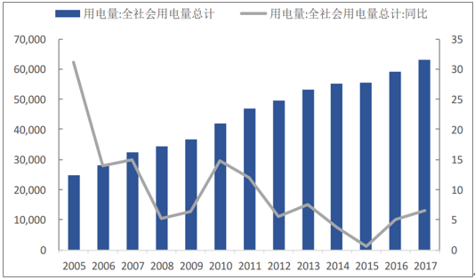 2011年之前,我國用電量增速較快,除2008年和2009年均保持在10%以上增速,隨著我國進(jìn)入經(jīng)濟(jì)轉(zhuǎn)型時期,從2012年開始,全社會用電量增速持續(xù)下滑,2015年增速更是下滑至低點(diǎn)0.5%。17年,供給側(cè)改革推動第二產(chǎn)業(yè)(占七成用電量)企業(yè)盈利能力增強(qiáng),疊加夏季高溫及煤改電政策,共同拉動17年全社會用電量增速回升至6.6%。然而,從長期來看,中國GDP增速步入新常態(tài),全社會用電量增長放緩是大趨勢,預(yù)計18年全社會用電量同比增速在4.5%~5.5%之間。