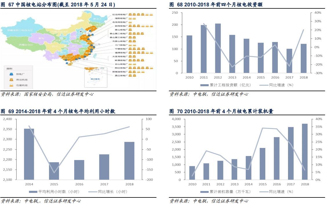 2018 年前 4 個月新增裝機(jī)容量為 113 萬千瓦,同比增長 4.0%。根據(jù)《2018 年能源指導(dǎo)意見》年內(nèi)計劃建成三門 1 號、海陽 1 號、臺山 1 號、田灣 3 號和陽江 5 號機(jī)組,合計新增核電裝機(jī)約為 600 萬千瓦。2018 年 2 月 15 日田灣 3 號機(jī)組投用,2018 年 5 月 24 日陽江 5 號實(shí)現(xiàn)并網(wǎng)發(fā)電,三門 1 號和臺山 1 號都已獲得首次裝料的批準(zhǔn)書,按照目前的項(xiàng)目進(jìn)度,保守估計海陽 1 號年底無法實(shí)現(xiàn)并網(wǎng)發(fā)電。